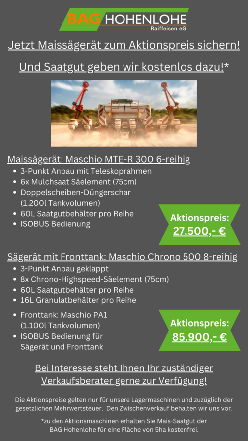 Voraussetzung für eine Reparaturabsicherung (Gewährleistungsverlängerung) ist ein Wartungsvertrag. Die Kosten für die Reparaturabsicherung und Wartung werden als Einmalbetrag vorab fällig. Diese Kosten können zusammen mit der Maschine über Agcofinance zu den gleichen Konditionen finanziert werden.