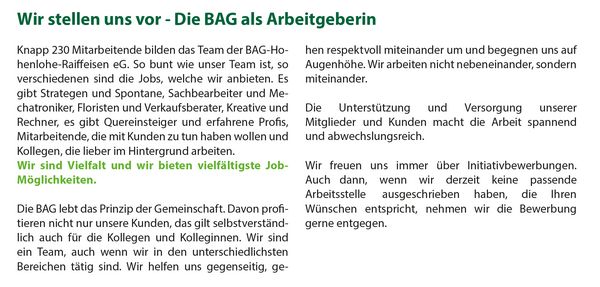 Wir freuen uns über Ihre Bewerbung per E-Mail an bewerbung@bag-hohenlohe.de oder per Post an die BAG-Hohenlohe-Raiffeisen eG, Personalabteilung, Ritterstraße 4, 74523 Schwäbisch Hall.